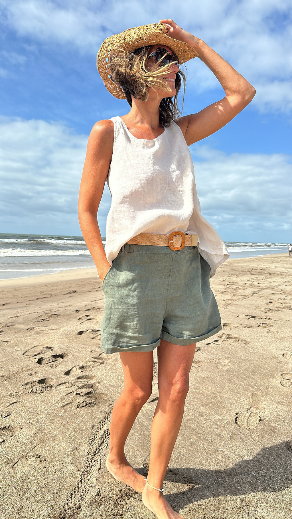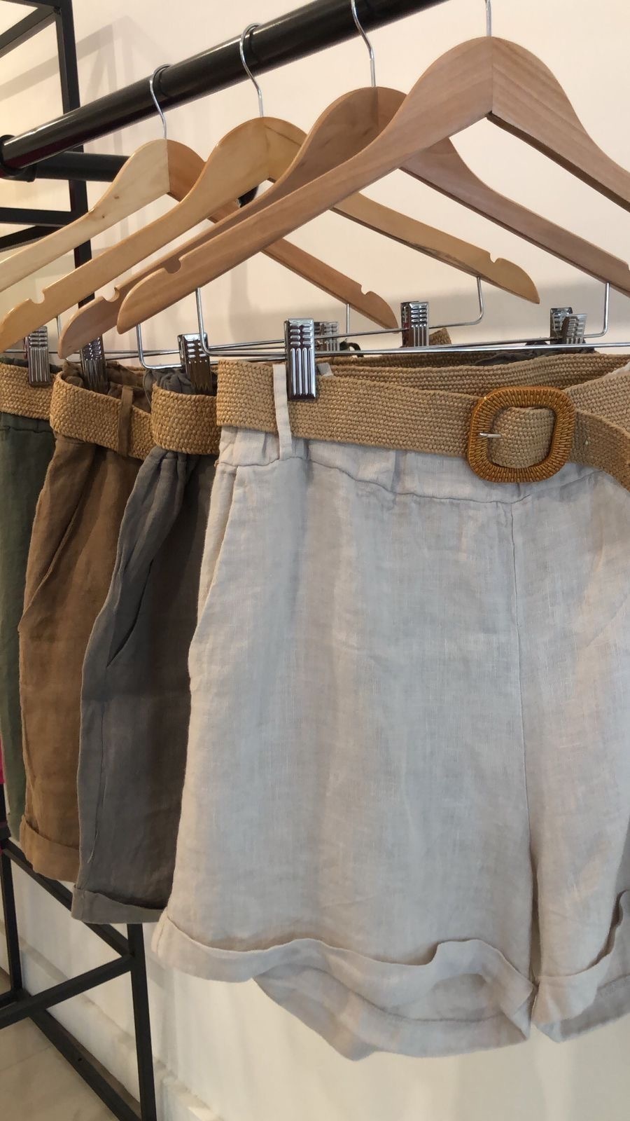 Short bermuda de corte clásico y amplio, con cintura elastizada y bolsillos laterales. Viene con cinturón de rafia elastizada.