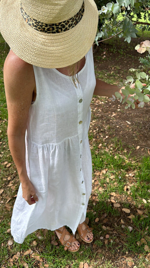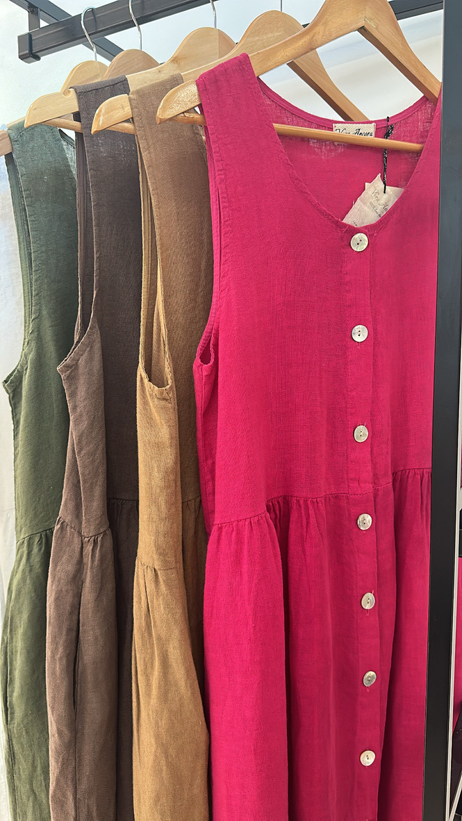 Vestido sin mangas, abotonado al frente con botones de nacar, 100% lino italiano